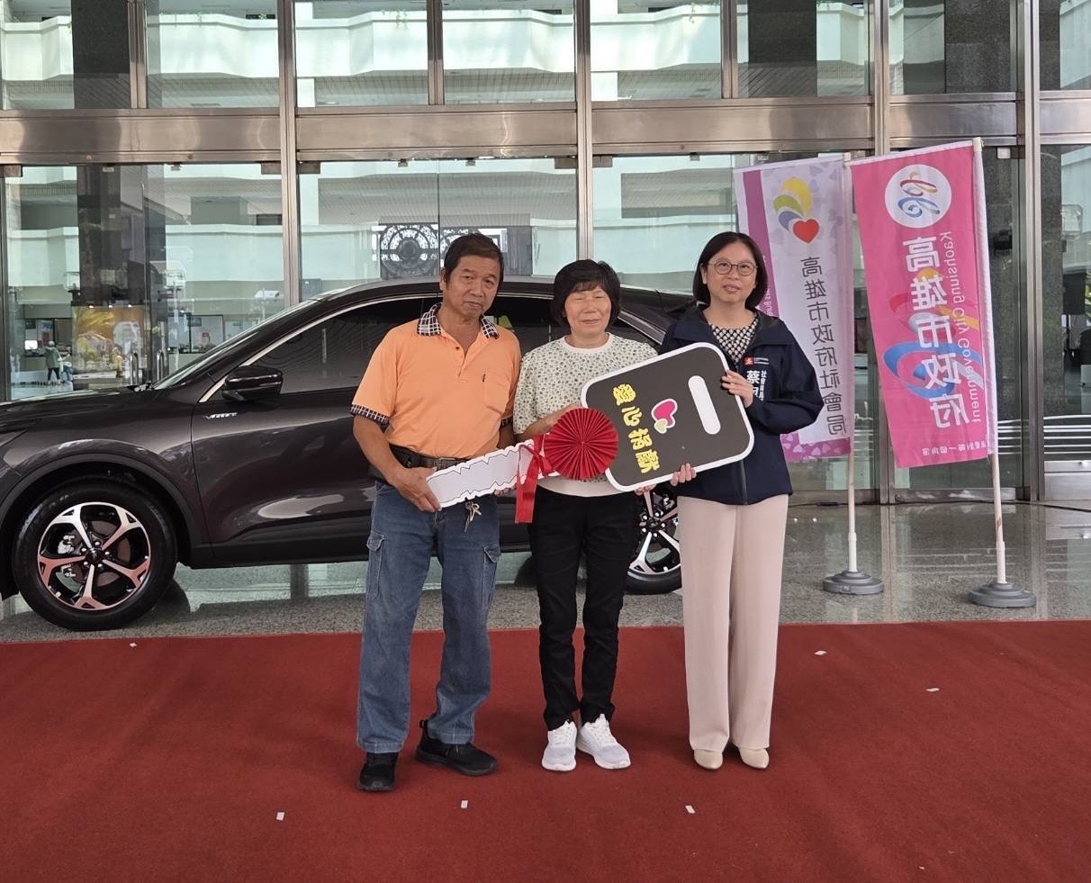 ↑圖說:林秋杏女士及陳辰嘉先生攜手捐贈97萬社福交通車。(圖片來源:高雄市社會局提供)