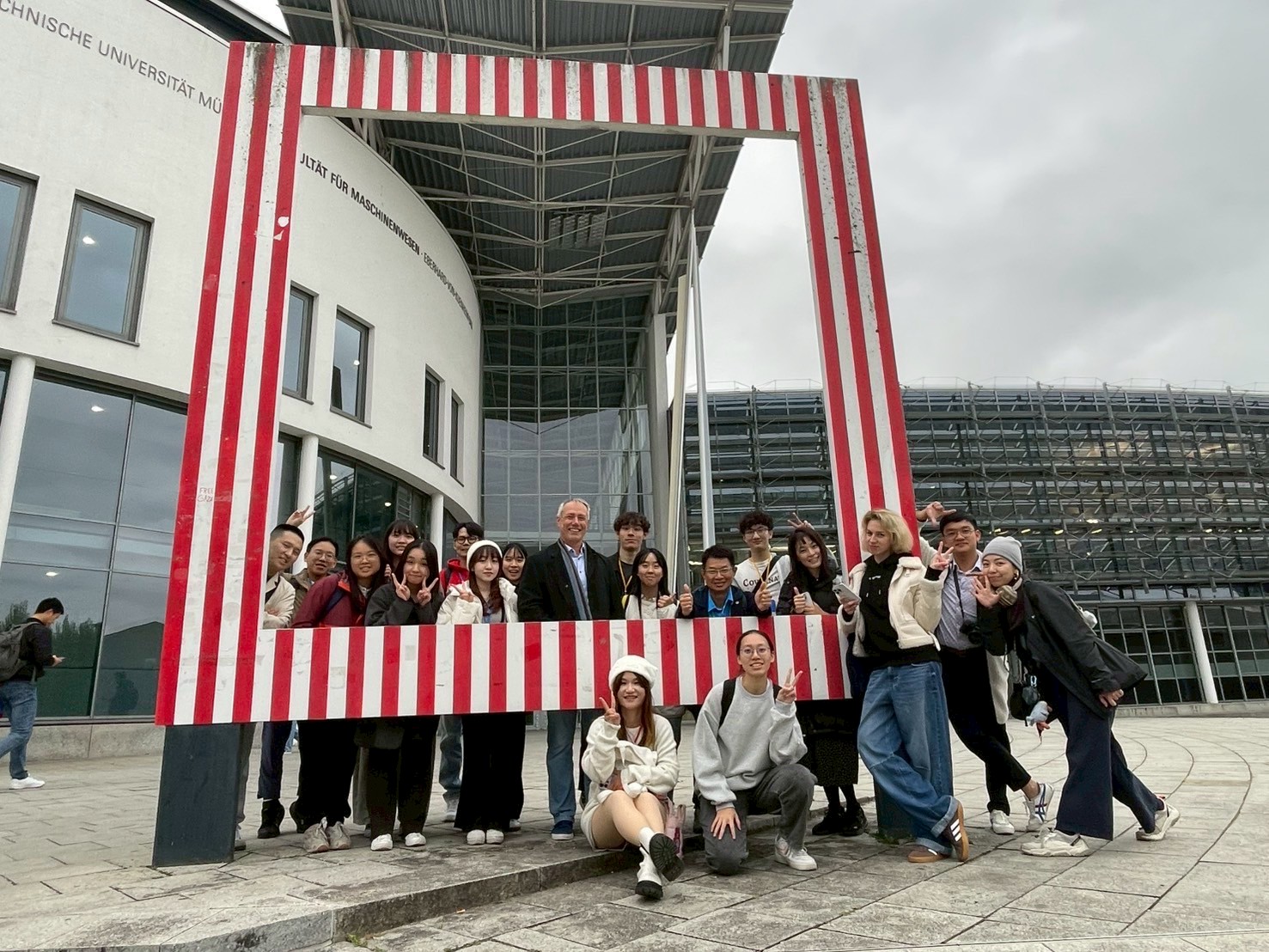 ↑圖說:慕尼黑工業大學代表向見習團進行校園導覽後,與學員一起在機械工程系門口合影。(圖片來源:高雄市青年局提供)
