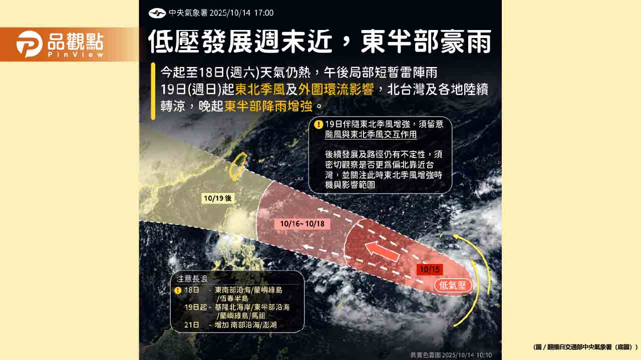 中央氣象署也在十日天氣預報中提到,10月19日至21日期間,受東北季風增強及熱帶性低氣壓或颱風外圍環流影響,台灣迎風面將出現明顯且範圍較大的降雨。基隆北海岸、東半部地區、恆春半島及大台北山區可能出現大雨或豪雨,其他地區也有局部短暫陣雨的可能。