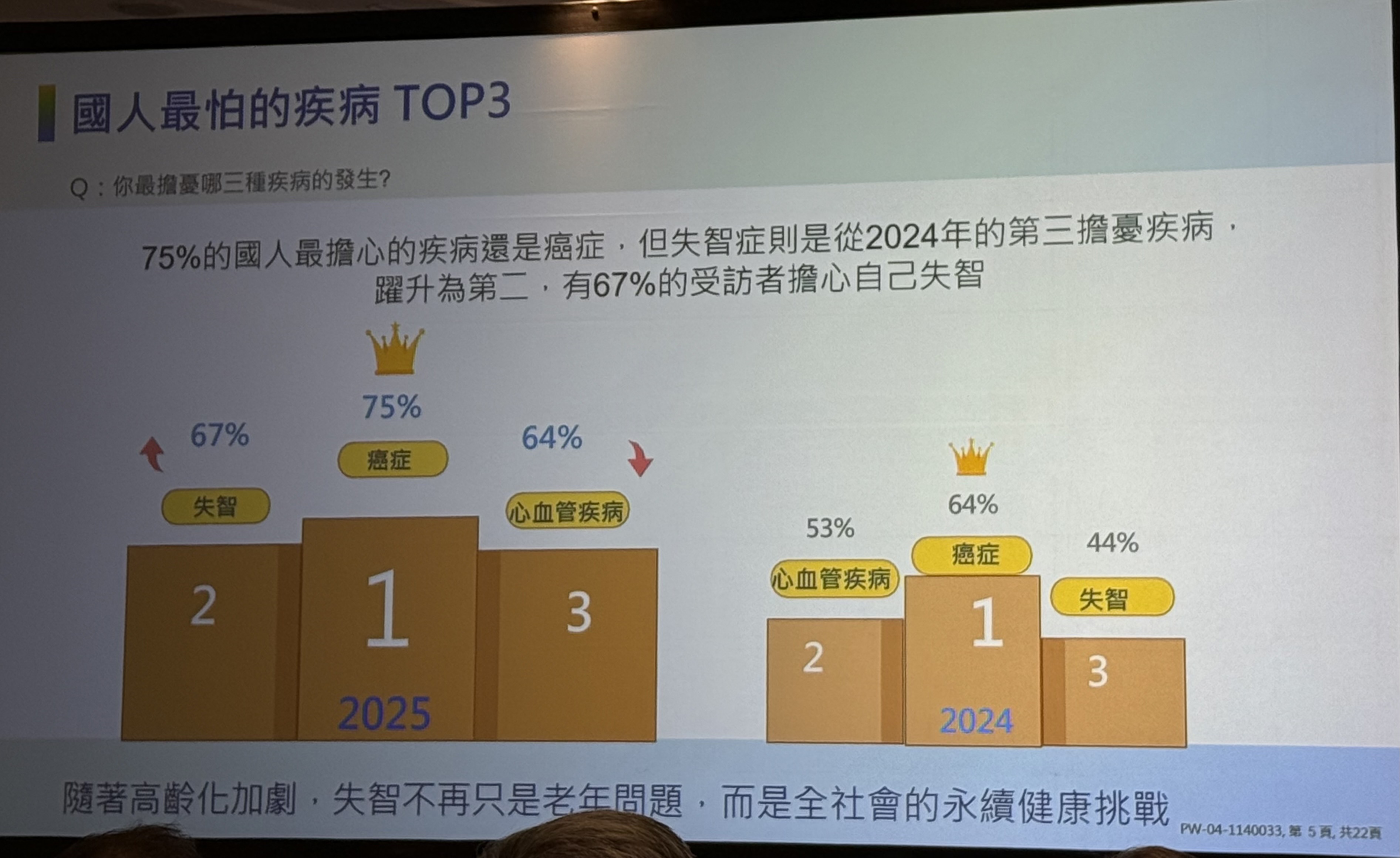 你知道國人最擔憂心哪3種疾病嗎?南山人壽與工研院健康樂活與智慧醫療照護聯盟今(15)日發布首份《2025永續健康白皮書》,揭露國人最擔憂的是癌症,比例高達75%,名次跟2024年的調查結果一樣;其次是失智症,占比達67%,比去年調查的44%大幅提高,名次也躍居第二,而且年輕世代的擔憂程度最高;第三名是心血管疾病。(如下圖,記者李錦奇攝影)