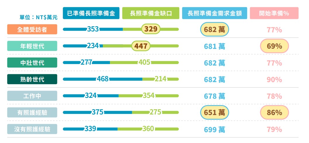 而且,逾3成年輕世代尚未開始準備、年輕人長照準備缺口更高達447萬元;反觀有照顧經驗者對長照準備最積極,高達86%有經驗者已開始準備,顯示照顧經驗幫助他們更早行動。