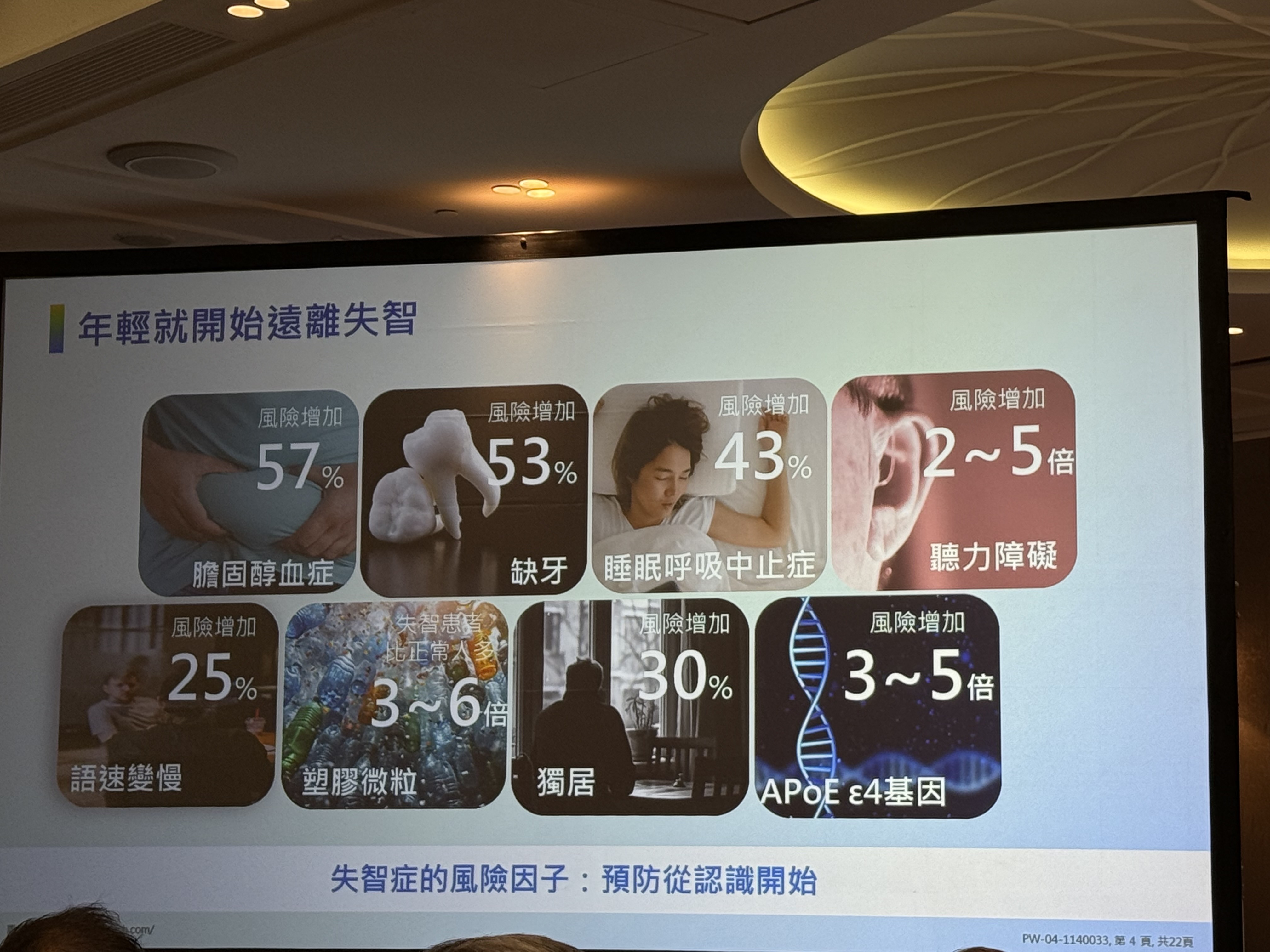 回頭來看《2025永續健康白皮書》,點出失智威脅正在加劇,塑膠微粒與睡眠不足都是失智危險因子,據研究指出,睡眠品質不佳,將會造成思考力認知功能下降、記憶力退化,有睡眠呼吸中止症者失智的風險增加約43%。