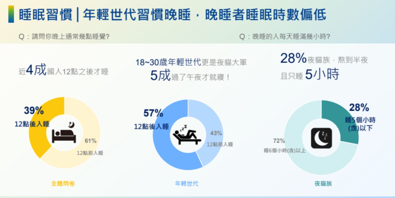 調查發現,約4成受訪者半夜12點後才就寢,且28%睡不到5小時。