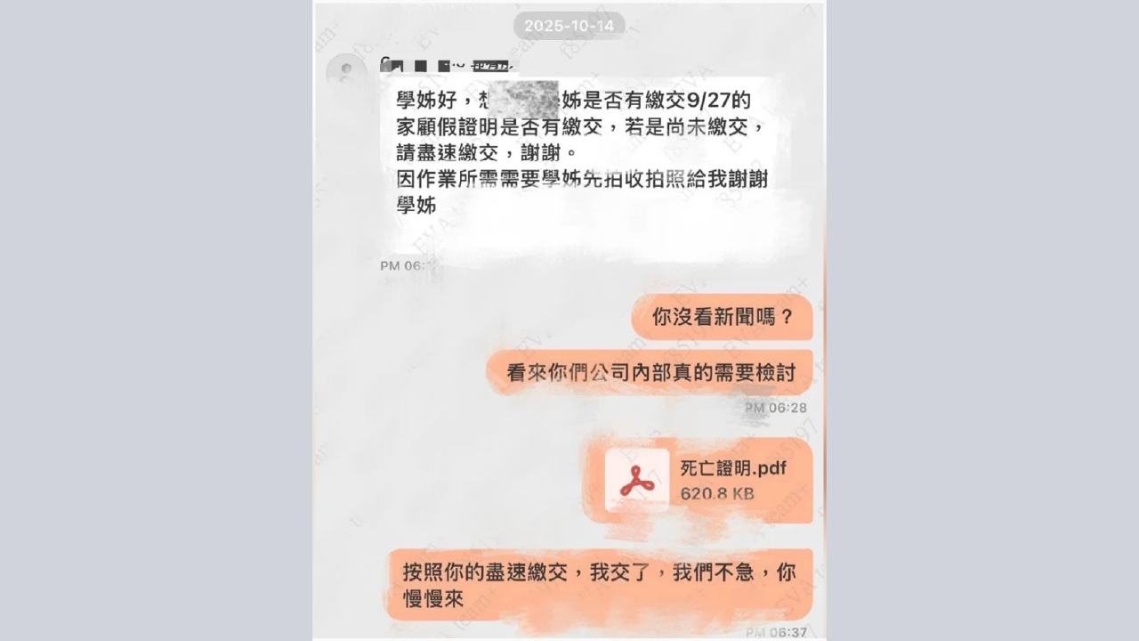 面對如此不近人情的要求,悲痛的家屬憤怒回應:「你沒看新聞?看來你們公司內部真的需要檢討」,隨即貼上死亡證明,並再次諷刺回覆:「按照你的儘速繳交,我交了,我們不急,你慢慢來」。