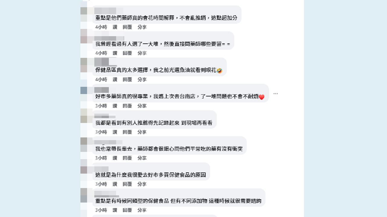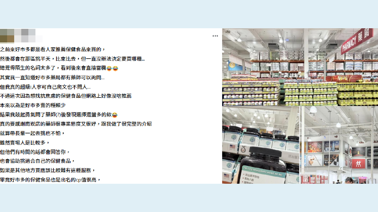 該名網友表示,過去都是看網路推薦購買保健食品,常在貨架前比較半天仍無法決定,「陌生的名詞太多,看到後來會直接當機」。這次諮詢經驗讓她驚喜發現,好市多藥師不僅專業且態度親切,會花時間做完整介紹,協助挑選適合的產品。