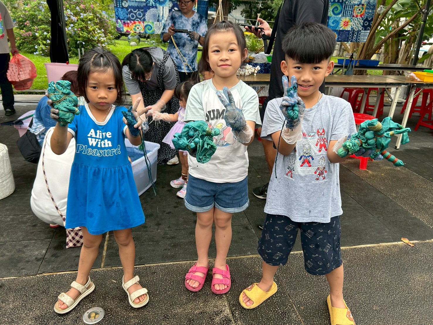↑圖說:小朋友體驗藍染領巾DIY,開心秀出他們的藍染創作(圖片來源:高雄市客委會提供)