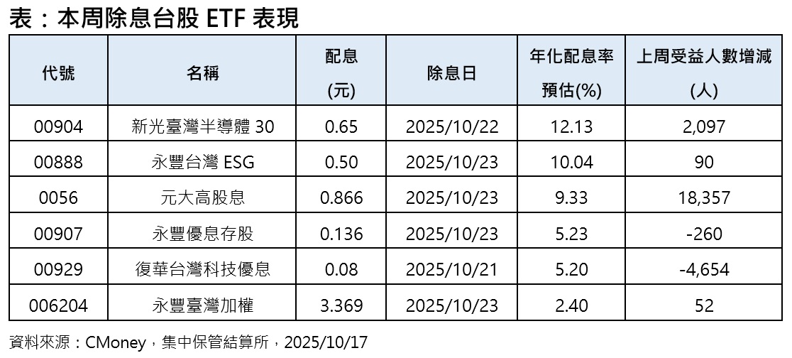 截至10/17統計,00904、00888與元大高股息(0056),10月以來受益人數大增,元大0056單週增逾1.8萬人,其次是新光00904成長2097人,10月以來成長率32.2%,躍升為這波台股除息ETF人氣黑馬。