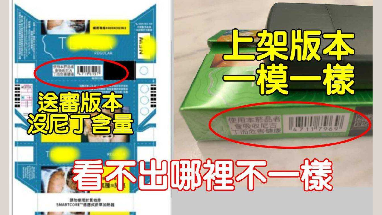 節目中也出示一組網路流出的資料圖,顯示業者送審版與實際上市版包裝一致。圖中可見送審樣本上本就未標示尼古丁含量,與實際上架包裝相同;主持人樊啟明並在現場拿出一包下架前購得的加熱菸,肉眼比對後確認包裝內容與送審圖一致,難以理解衛福部何以認定不符審核文件。