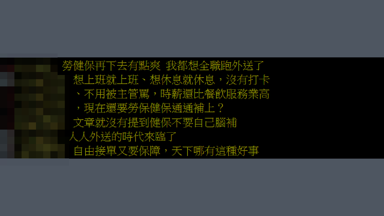 網路上有網友在PTT發文指出,外送員「想上班就上班、想休息就休息,沒有打卡、不用被主管罵,時薪還比餐飲服務業高,現在還要勞保健保通通補上?」引發網友一面倒的討論。「這群人也太爽了吧!」、「自由接單又要保障,哪有這種天下好事?」成為最熱門留言。