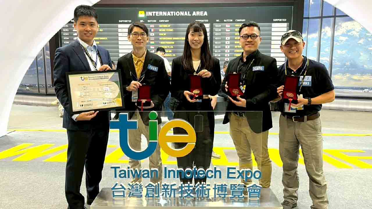 ↑圖說:東海大學於全國最具規模的科研盛會「台灣創新技術博覽會」中,勇奪一金三銅及企業特別獎五項大獎。(左2)企管系張譽騰教授、(右2)化材系李冠廷教授。(圖片來源:東海大學提供)