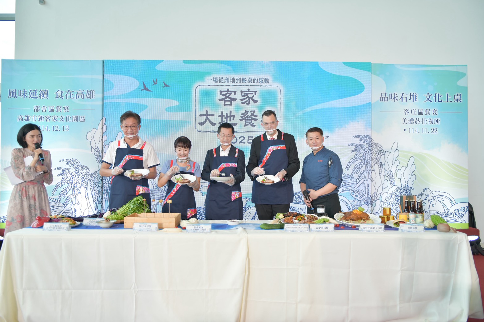 高雄市政府秘書長郭添貴表示,「客家大地餐桌」已成為推動高雄客家飲食文化的重要品牌,不僅展現地方食材的多樣風貌,更讓農產、廚藝與文化融合出新價值。今年活動將舉辦兩場以「風土」為題的饗宴——11月22日於美濃菸仕物所登場的「客庄區餐宴」,由在地餐廳聯手詮釋客庄風味與產地精神;12月13日則移師高雄新客家文化園區,由藍帶主廚李子竟領軍打造「都會區餐宴」,以高雄在地食材結合法式技法,演繹客家料理的創新層次。