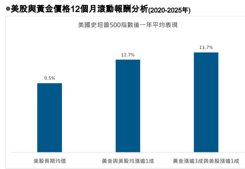 即便在金價上漲30%、美股漲逾10%的情況下,後續一年美股平均報酬仍高達13.7%,顯示金價走強並非股市的利空因素。