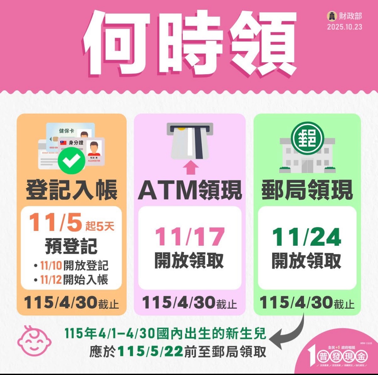 要到官網https://10000.gov.tw(←點這邊)登記入帳,11月5日起,開放為期5天預登記,11月10日開放登記,11月12日開始入帳。