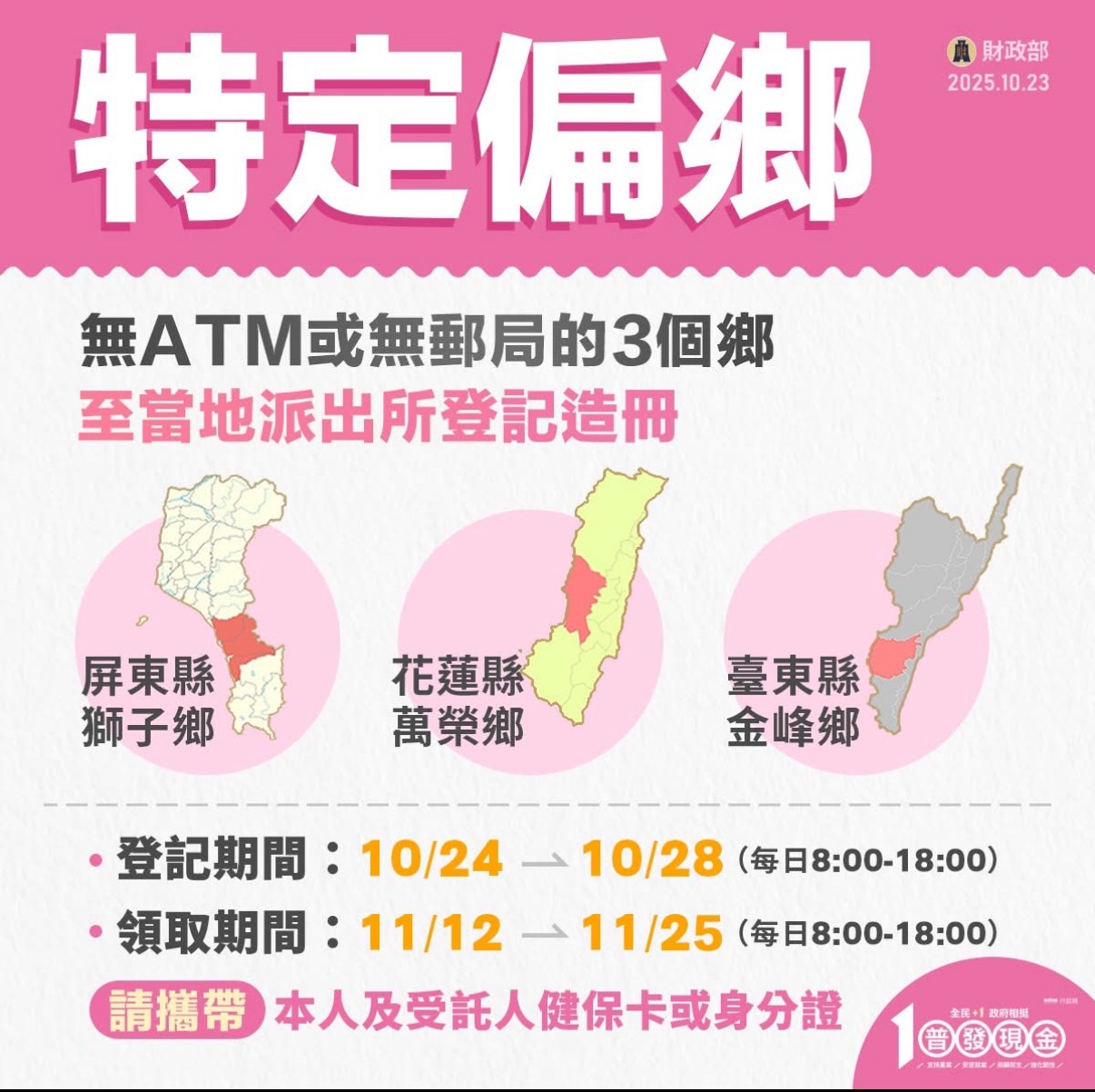 10月24日開放偏鄉地區造冊登記,凡居住且設籍在屏東縣獅子鄉、花蓮縣萬榮鄉及臺東縣金峰鄉民眾,從10月24日起至28日,共5天,可攜帶身分證明文件前往當地7個派出所或分駐所登記,當地員警為服務鄉民,假日不休息也受理登記(每日8時至18時);已登記民眾請於11月12日至25日至登記之派出所或分駐所領取。