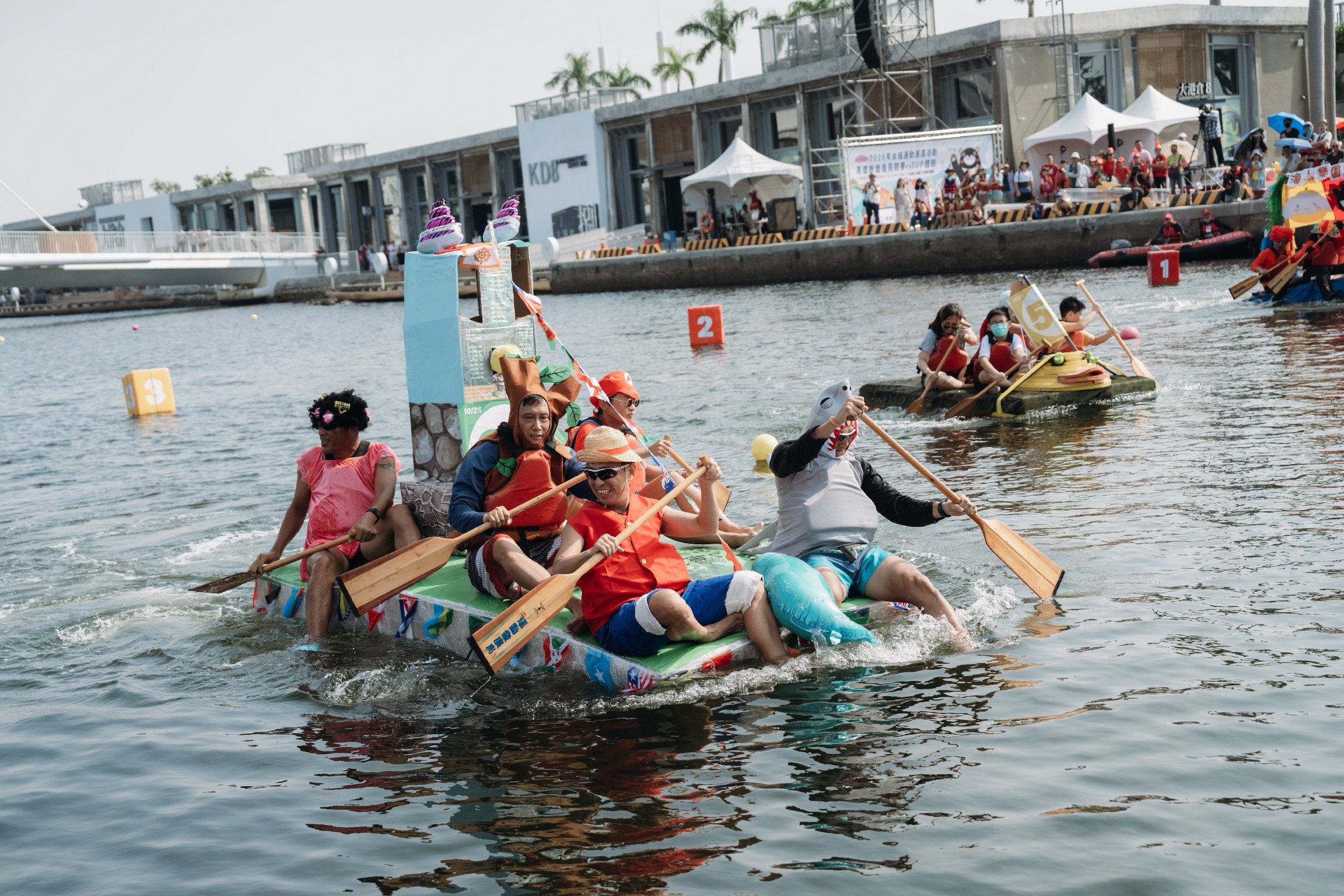 由高雄市政府運動發展局主辦的創意造筏競賽,今年邁入第三屆,吸引全台各地約500名選手參賽,從企業團體到親子家庭,隊伍造型創意百出、風格各異。來自桃園的「木頭人」隊以精湛木工手藝打造兼具穩定與美感的木製船筏,奪得「創意造型獎」冠軍;家庭組「同心協力」則以回收材料打造環保船筏、親子攜手完賽,勇奪「環保永續獎」冠軍,展現寓教於樂的綠色精神;而「沈船股份有限公司」則以幽默命名與穩健表現贏得現場觀眾掌聲與笑聲,榮獲「最佳人氣獎」冠軍。