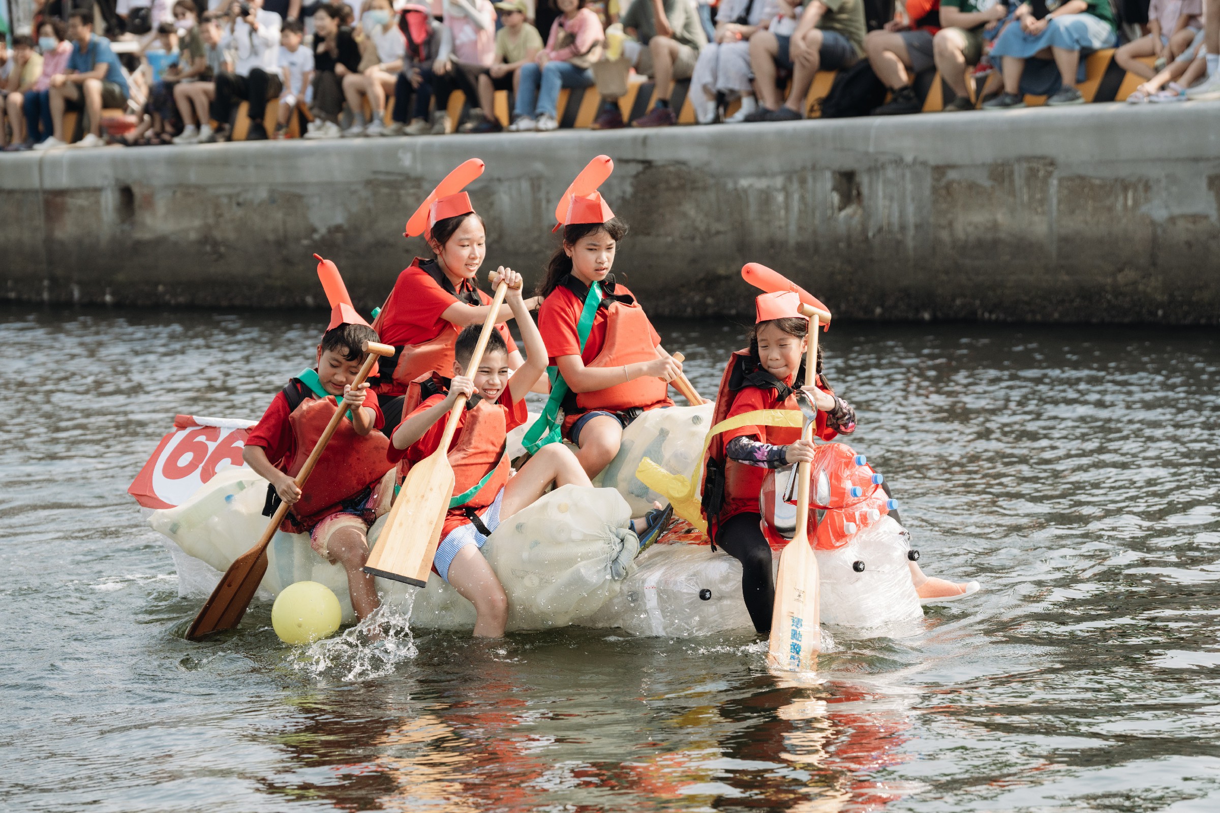 比賽過程高潮迭起,不少隊伍以創意取勝,更有勇氣可嘉的參賽者掀起全場喝采。國際學校學生組成的「大腸包小腸」隊,以全回收寶特瓶打造船筏成功完賽,令人驚艷;「王家NO.1」則多次翻船仍不放棄,最後靠著毅力游回終點,現場觀眾報以最熱烈掌聲,完美詮釋運動家的精神。