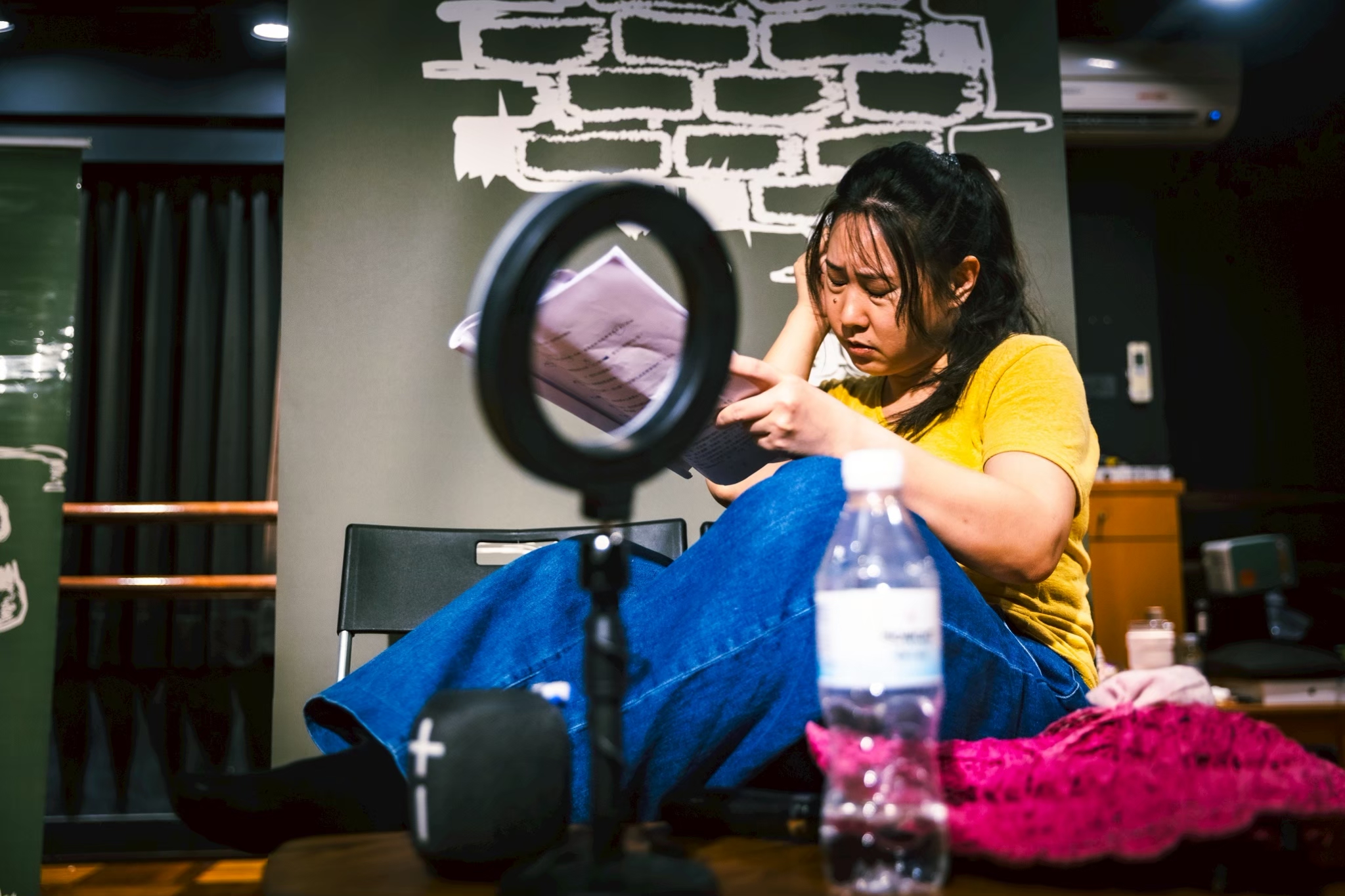 ↑圖說:演員置身鏡頭環境,專注翻閱劇本,映照自媒體時代的真實掙扎。(圖片來源:攝影林善淳/高雄市文化局提供)