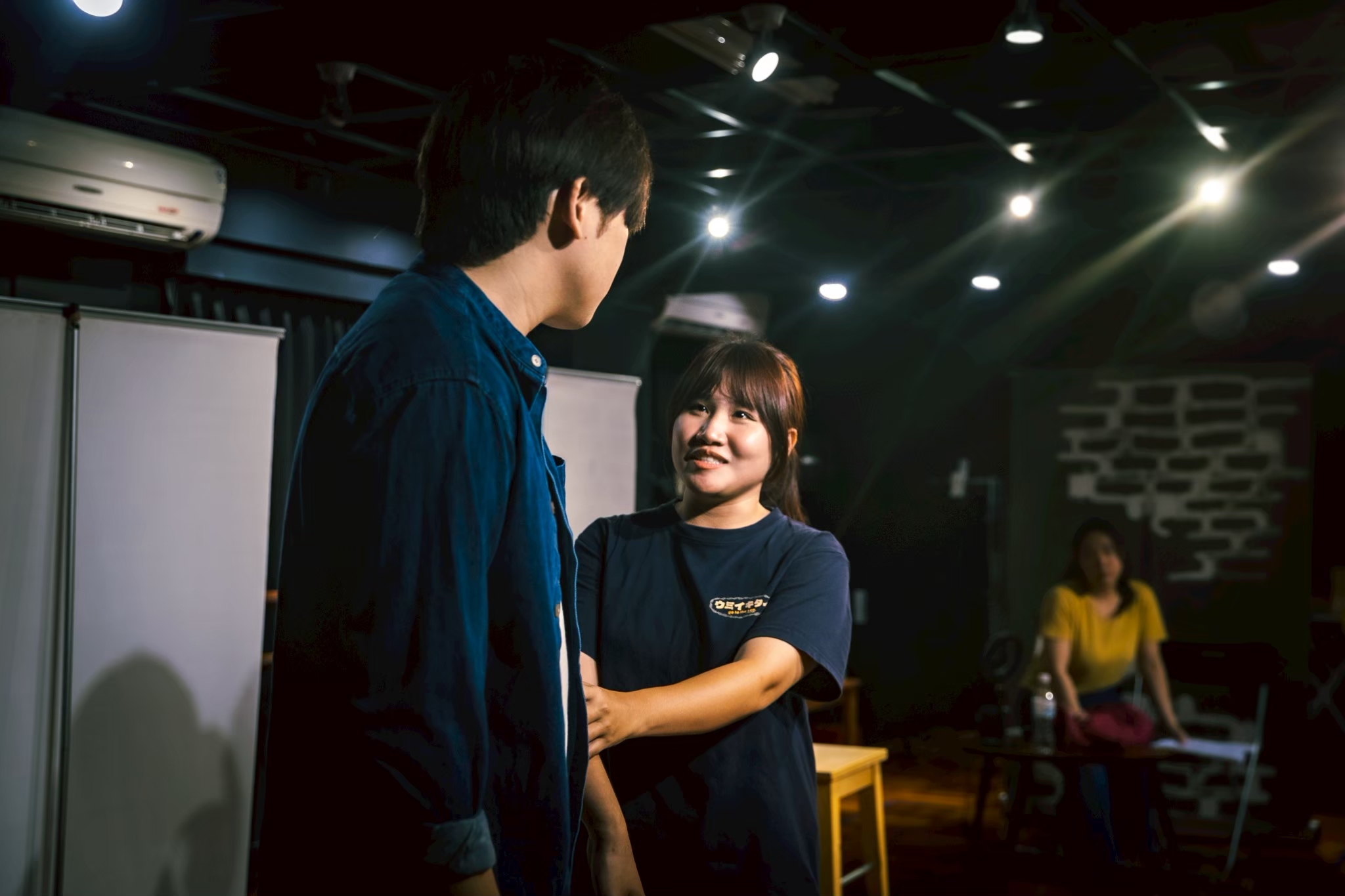 ↑圖說:演員在排練裡演繹主角的年少時光,以真摯交流展現多重角色轉換的表演張力。(圖片來源:攝影林善淳/高雄市文化局提供)