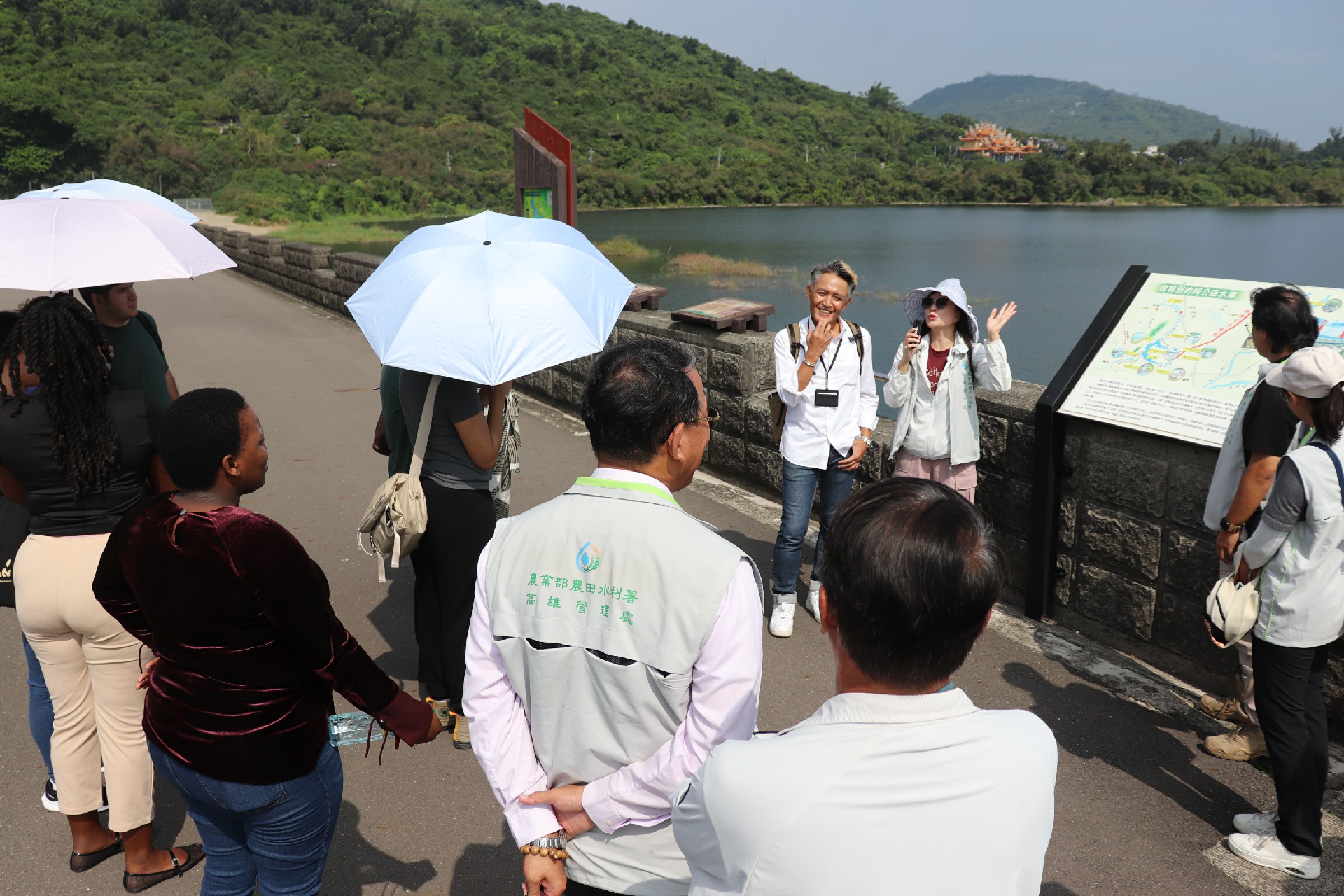 接著,阿蓮工作站站長吳仲穆示範遠端閘門遙控系統的操作,說明如何結合即時數據監控,達到灌溉精進與防災應變的目標。邦交國青年學員們除親眼見證台灣在農田管理上的自動化成果,也在壩頂合影留念,對台灣在水利技術上的發展留下深刻印象。