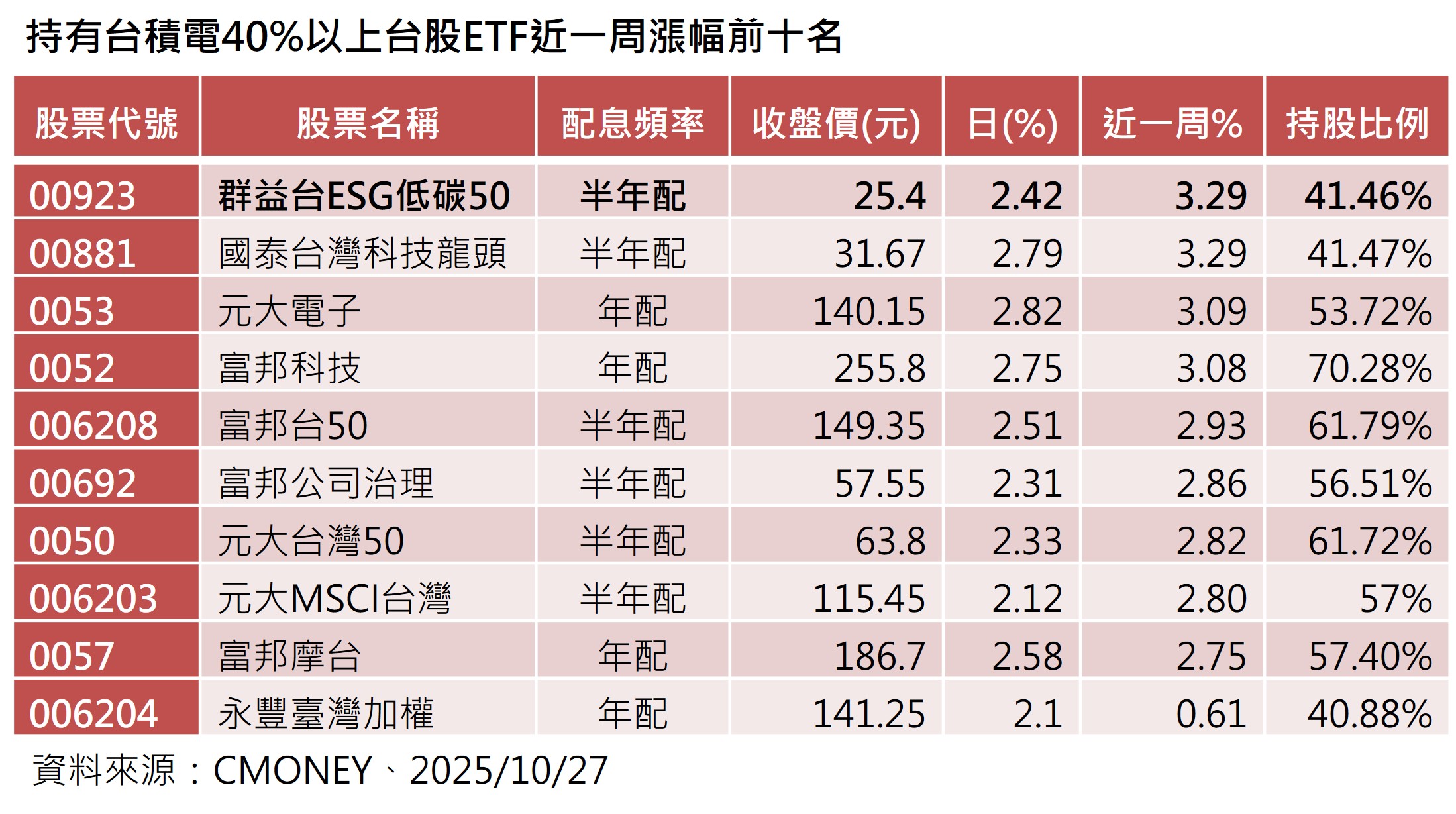 群益台ESG低碳50(00923)也在10月初放寬台積電權重上限,目前持有台積電比例已超過41%。