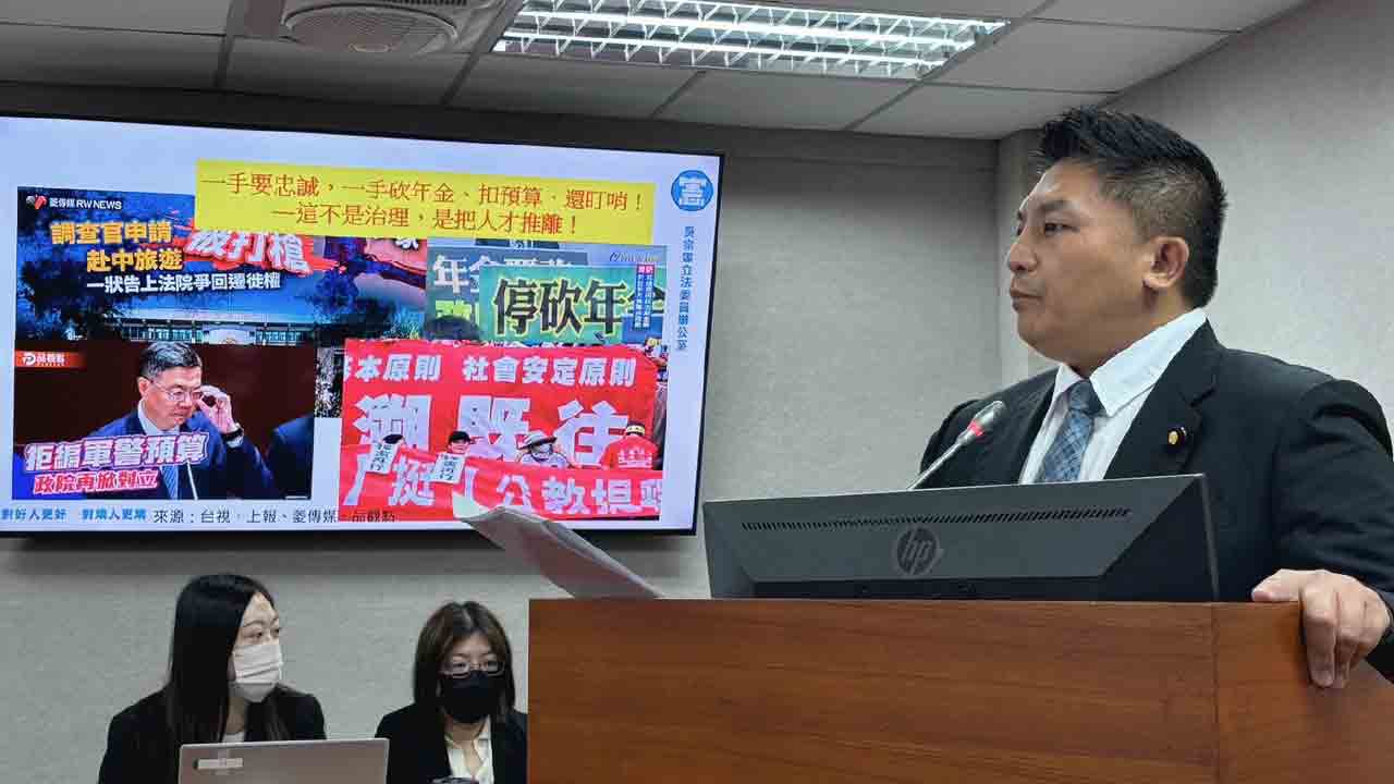 國民黨立委吳宗憲今(29)日在立法院質詢人事行政總處長蘇俊榮時痛批,民進黨政府對待公務員「雙標又傲慢」,從根本上摧毀文官體制的向心力。他直言,一手要求公務員忠誠、一手卻砍年金、扣預算、嚴查出境,「這不是治理,而是把人才推離!」