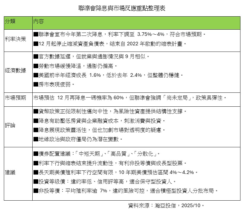 瀚亞投信分析,聯準會態度謹慎,政策方向仍將依據經濟情勢調整。此次降息後,基準利率區間降至3.75%至4%,有助壓低房貸與企業融資成本,進而刺激消費與投資。