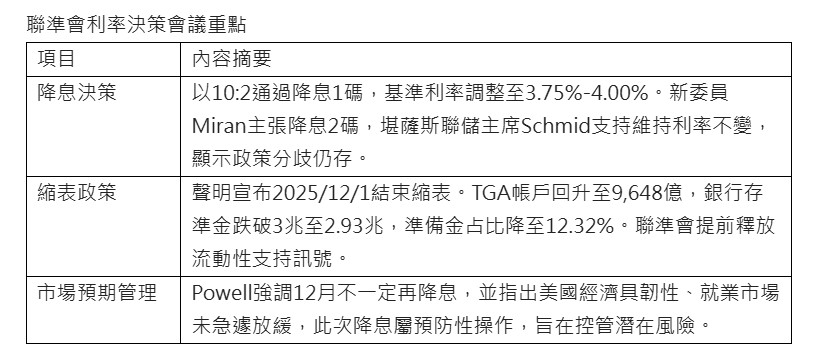 「鉅亨買基金」認為,聯準會停止縮表並非流動性危機的預兆,而是為提前防範潛在風險,確保金融體系穩定。主席鮑爾在會後記者會上刻意淡化市場對連續降息的預期,顯示政策焦點已從抑制通膨轉向穩定經濟與金融環境。