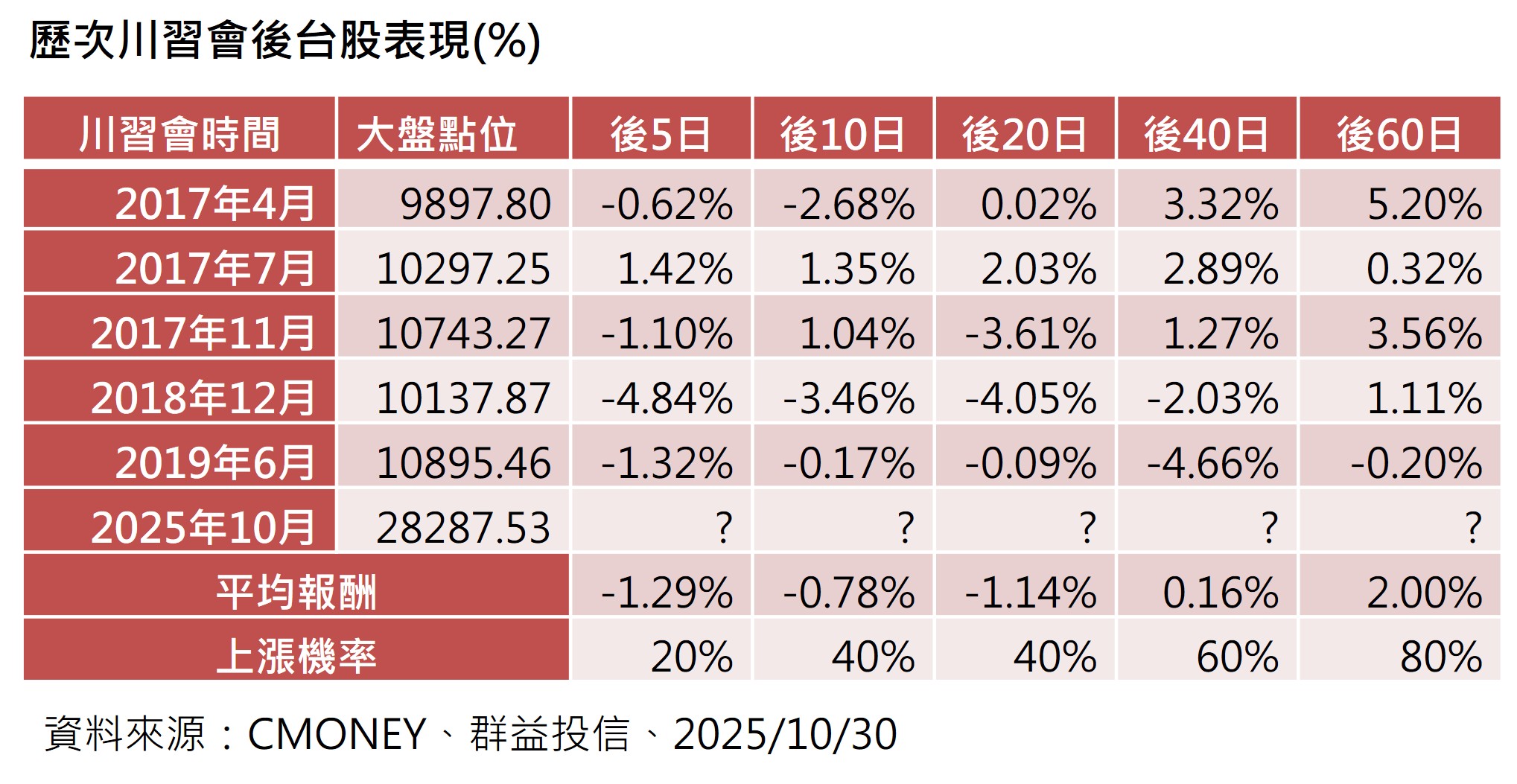 第六次川習會落幕,群益投信統計顯示,過去川習會後,對台股表現並無太大影響,平均表現漲跌互現,台股除了基本面外,主要還是受國際股市與外資加碼影響較大。