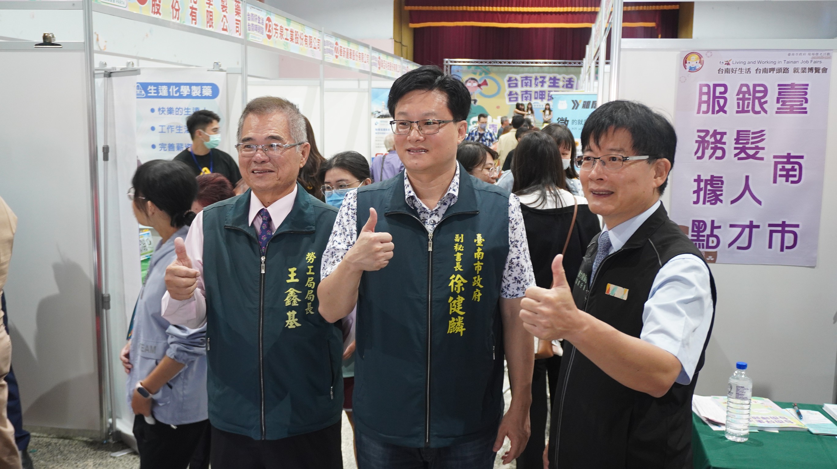 ↑圖說:臺南市副祕書長徐健麟(中)、勞動部勞動力發展署雲嘉南分署分署長劉邦棟(右)、勞工局局長王鑫基(左)為求職者「加油打氣」。(圖片來源:臺南市勞工局提供)