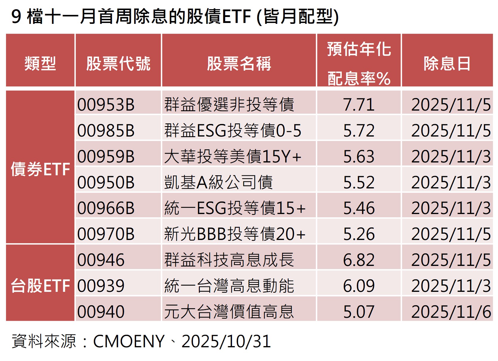 11月ETF除息秀登場,其中,首周除息的股債ETF共計有9檔,全為月配型,其中有6檔債券ETF,3檔為台股ETF,以預估年化配息率來看,群益優選非投等債(00953B)以7.71%居冠,群益科技高息成長(00946)以6.82%為本波除息台股ETF的配息王。