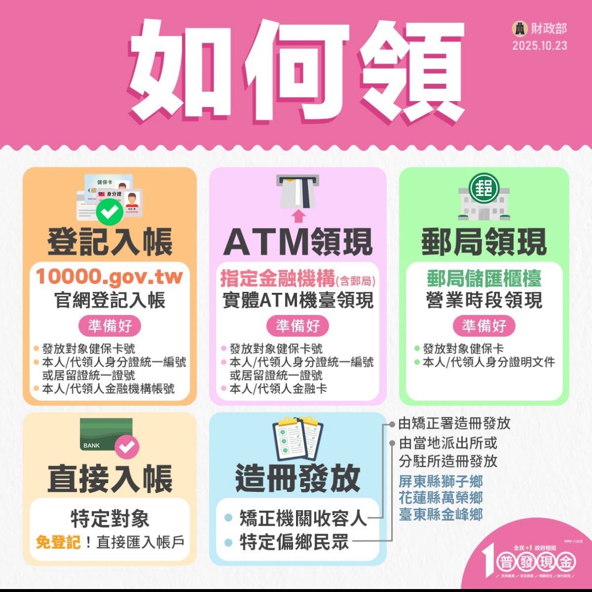 這次普發現金,一共有5種領取方式,可依民眾習慣自行選擇。除了前述的登記入帳;另外還有ATM領取,11月17日開放;直接入帳是11月12日匯入;造冊發放的登記時間是10月24日~10月28日,11月12日至11月25日領取。