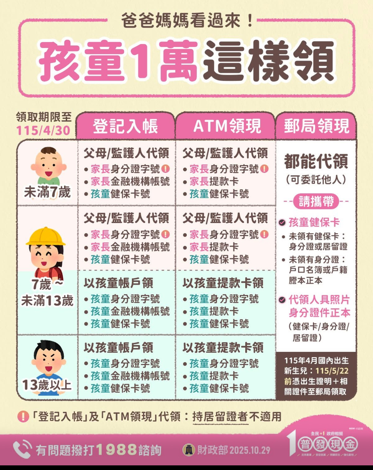 至於孩童該如何領取?可分為未滿7歲、未滿13歲、13歲以上,三種類型,財政部也特別製作圖表(如下),供民眾參考。