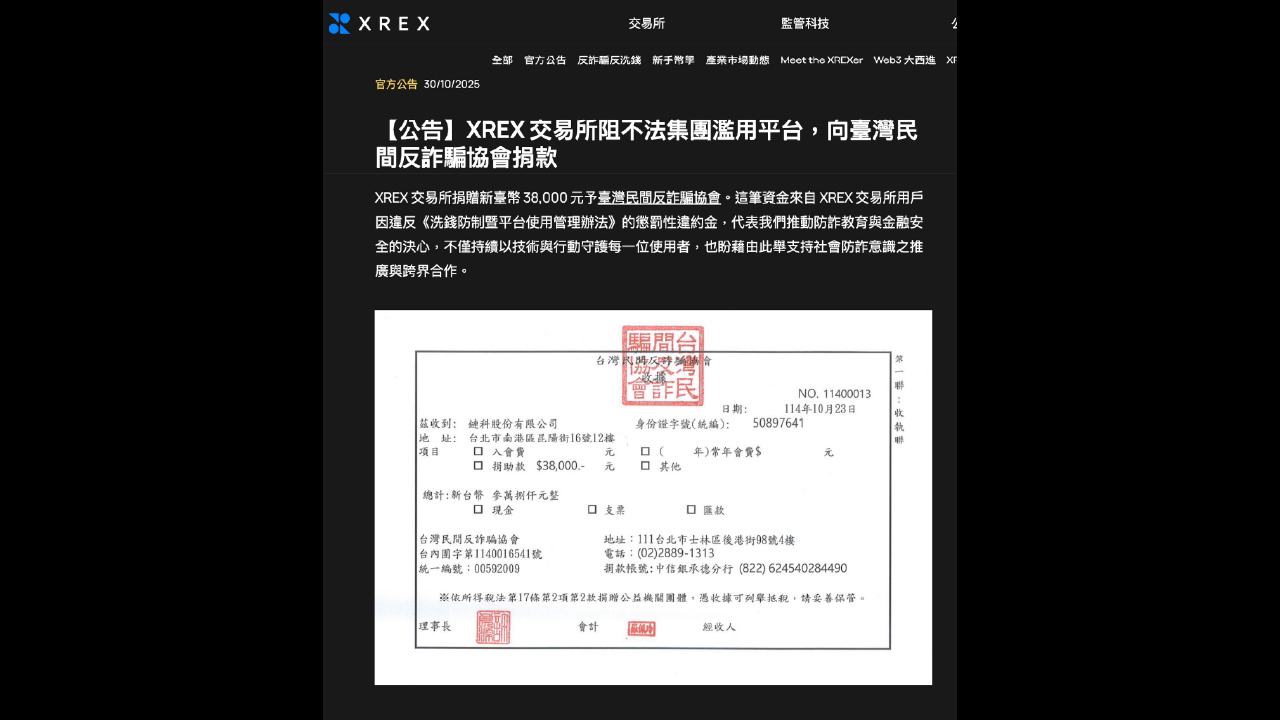 ↑圖說:XREX 交易所捐贈新臺幣 38,000元予台灣民間反詐騙協會。這筆資金來自違反《洗錢防制暨平台使用管理辦法》的XREX交易所用戶被扣的懲罰性違約金。(圖片來源:翻攝自XREX交易所官網)