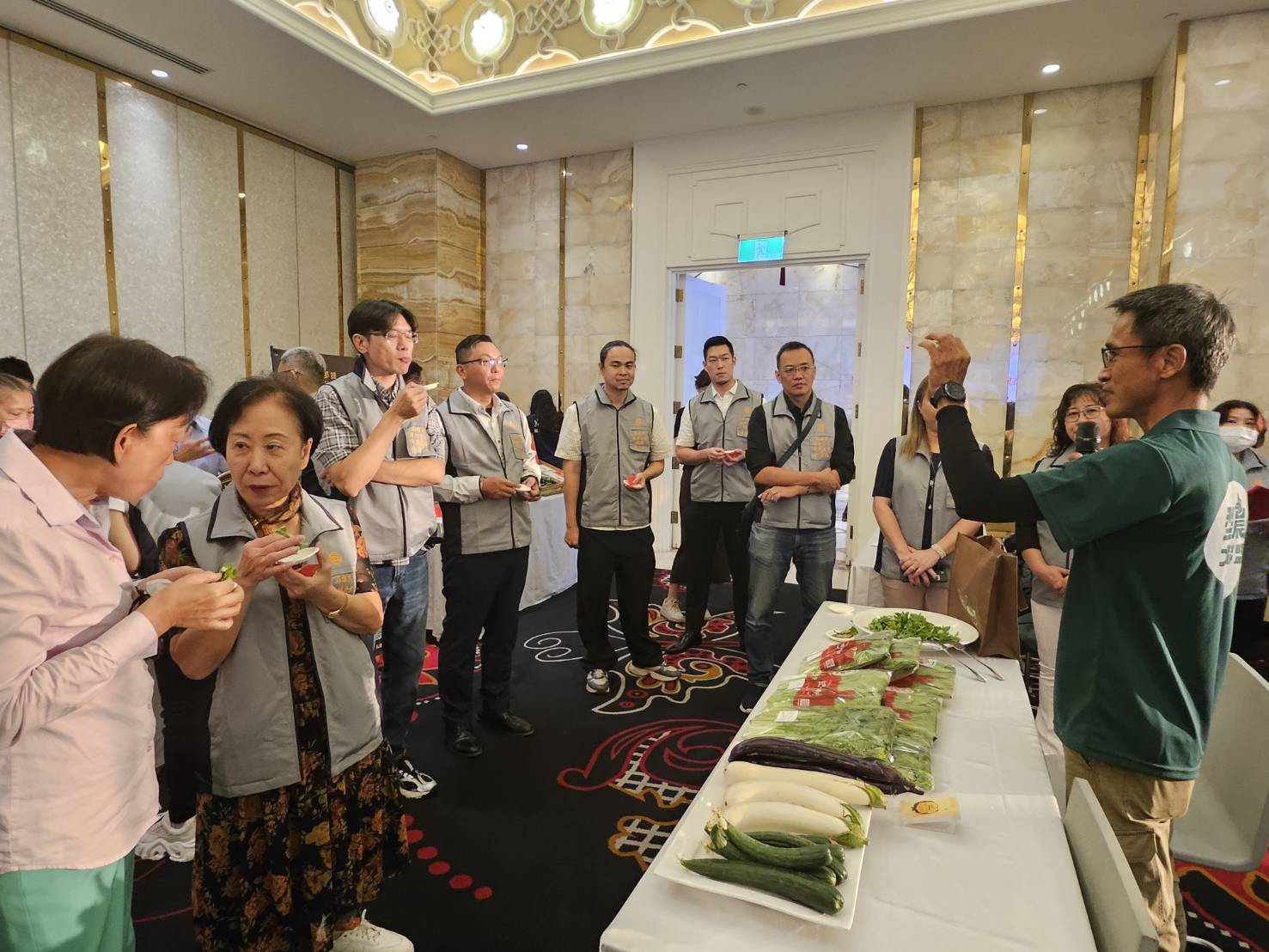 ↑圖說:今年榮獲首屆國家食農教育傑出貢獻獎優等獎的「李法憲農園」,帶來各式有機蔬果等在地食材,現場安排旅館業者試吃與洽談。(圖片來源:高雄市農業局提供)