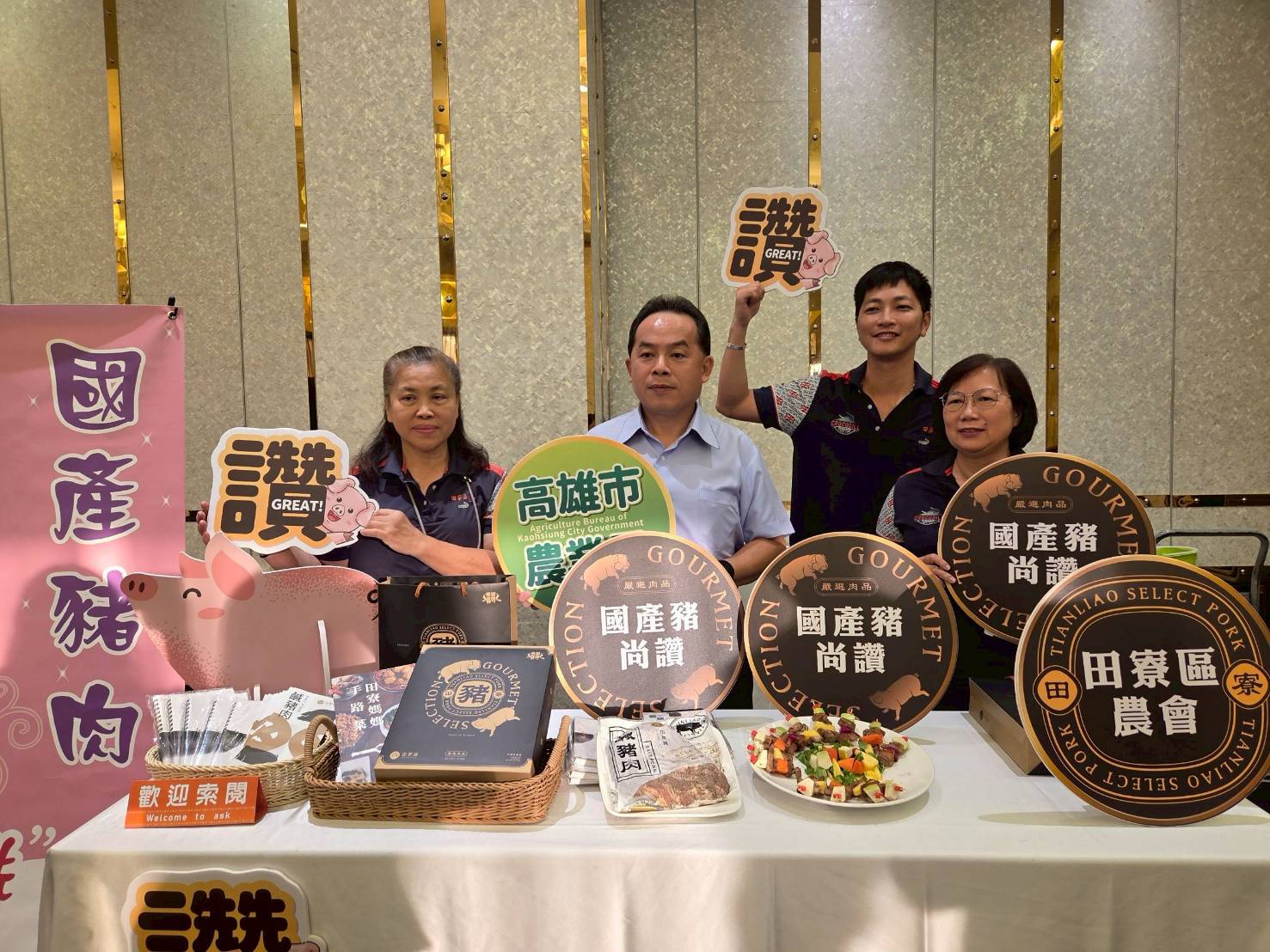 田寮農會特別以鹹豬肉果串讓來賓現場品嚐,獲得一致好評。農業局也藉此呼籲,國產豬肉均通過屠宰檢驗,安全無虞,非洲豬瘟不會人畜共通傳染,鼓勵旅館業者多選用高雄在地優質肉品,為消費者端上安全又美味的國產食材。