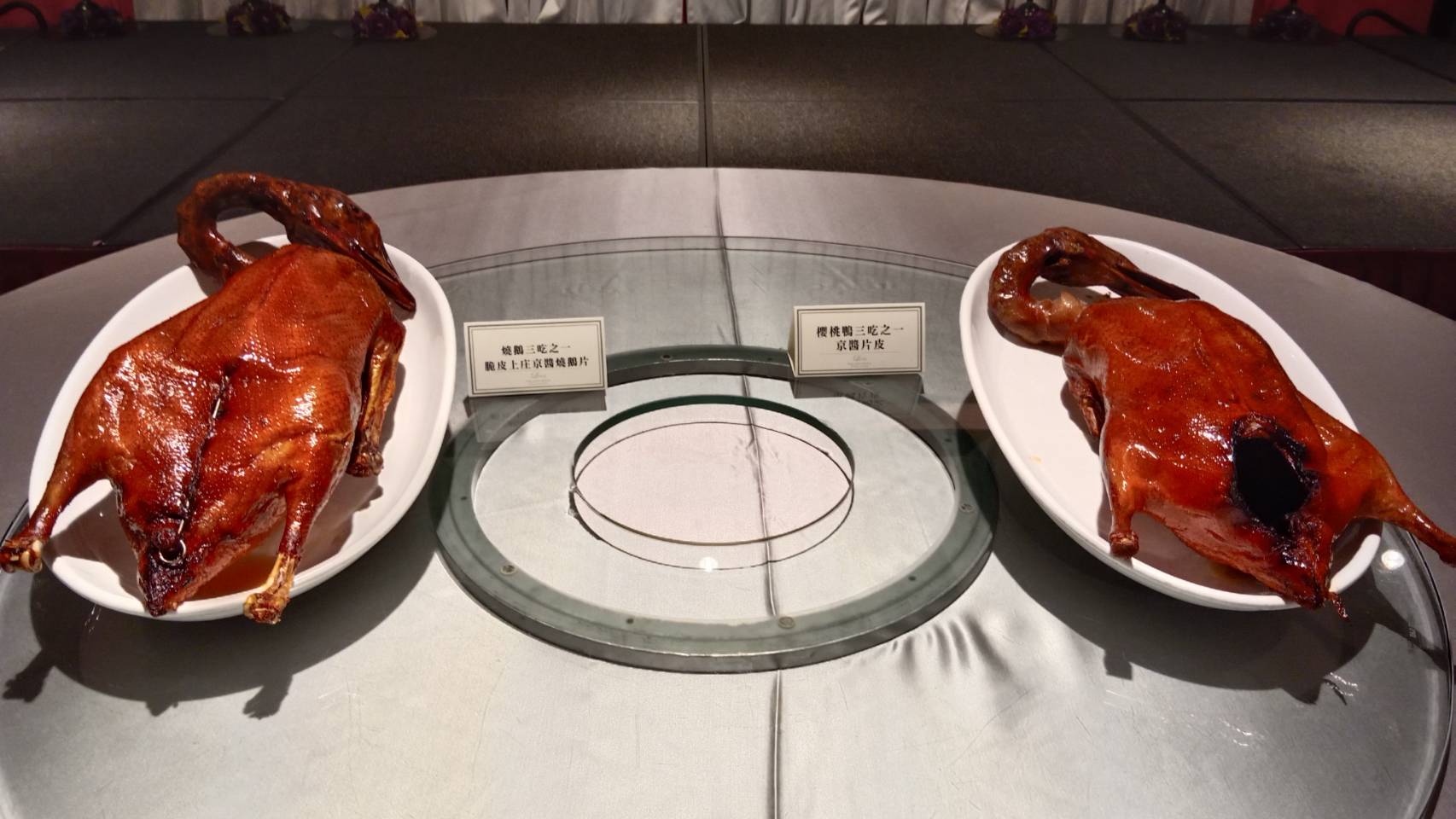 圖說:麗尊「萬元經典幸福饗宴」選用重四公斤的宜蘭櫻桃鴨(右)與五公斤重的大鵝。(圖片來源:韓文明拍攝)