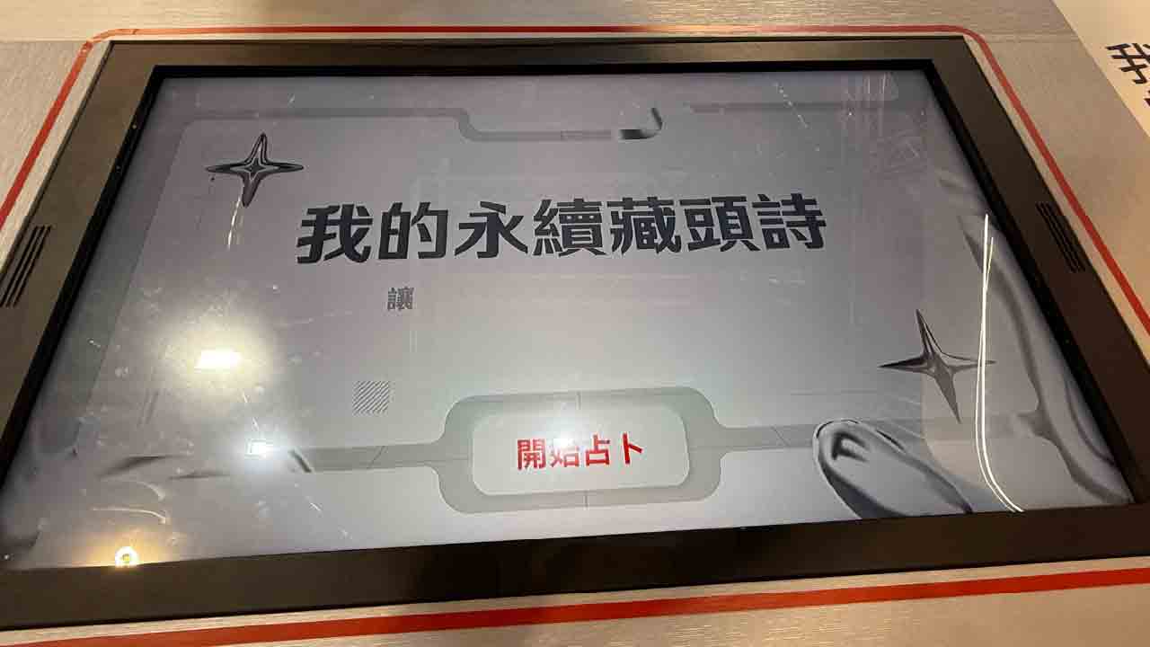 另外,永豐金展場還有藏頭詩互動遊戲,只要在觸控螢幕輸入姓名,回答簡單問題,機器就會自動為你寫成一首藏頭詩,一樣會秀在上方的大螢幕,趣味感十足。(如下圖,記者李錦奇攝影)