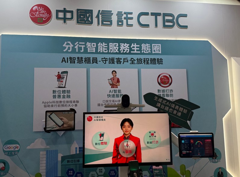 特別的是,現場也展示個人及企業用戶專屬的智能服務,例如「智能分行服務生態圈」,融合數位體驗、AI智能以及數據打詐三大關鍵科技打造「AI智慧櫃員」(如上圖,記者李錦奇攝影),協助需前往分行辦理業務的客戶提前預約,提醒時間及應帶文件,並於客戶抵達時以對談方式,蒐集客戶資訊,比對內外部防詐資訊,若有需要,亦可通報行員、警察機關共同阻詐。