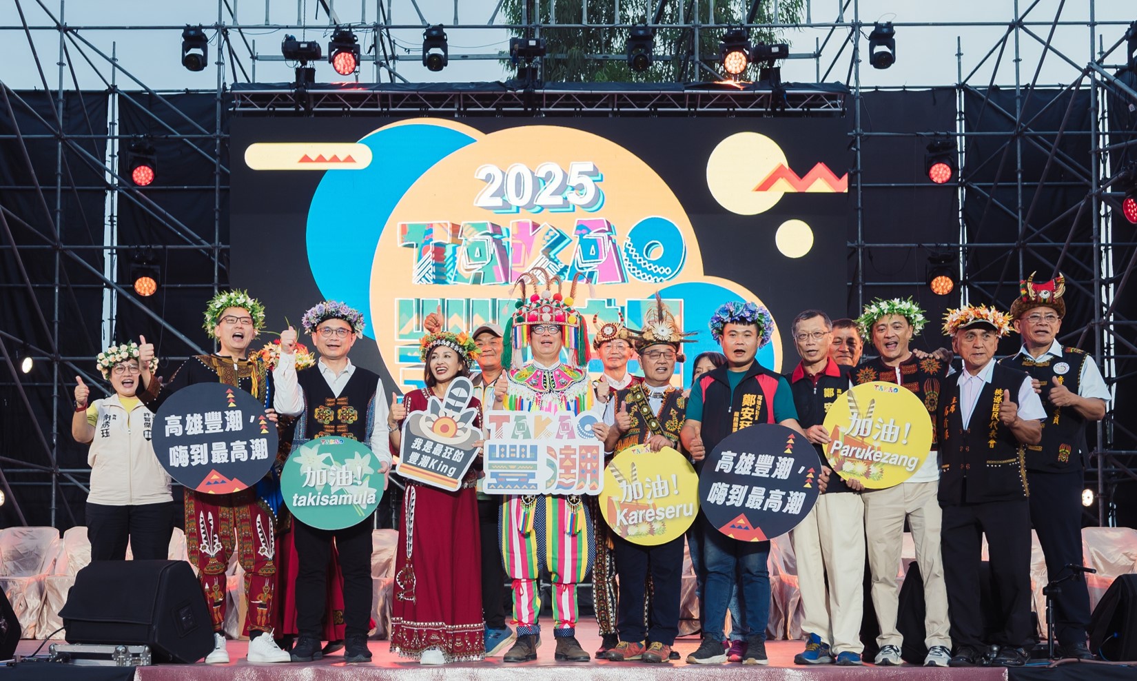 高雄擁有全國最完整的16族原住民族豐富文化資產,「2025 TAKAO豐潮」原住民族聯合豐年節,創歷年規模最大,於衛武營隆重登場,市長陳其邁8日身穿傳統服飾,與立法委員邱議瑩和賴瑞隆,以及市議員高忠德、陳幸富、范織欽與黃文益一同參與盛會,並加入千人圍舞行列,與林信明總頭目、各同鄉會頭目耆老及族人等,隨著音樂節奏手舞足蹈,高呼「TAKAO豐潮」,氣氛熱烈歡騰。陳其邁與眾多貴賓走逛豐潮超過170攤的特大市集,品嚐美味烤豬和山籟愛玉,也希望市民朋友多多支持原民精選好物。