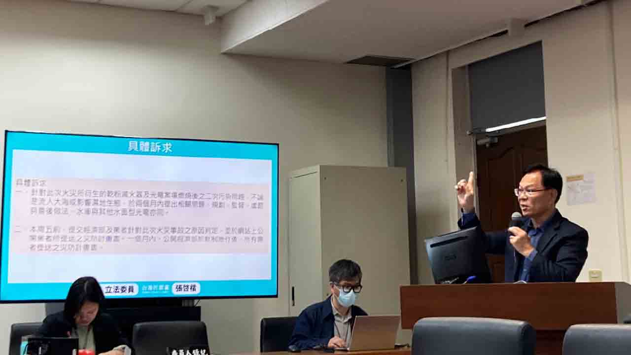 張啓楷要求經濟部兩個月內提出火災二次污染問題的規劃、監督、處罰與善後做法,本周五前提交火災原因判定並公開災防計畫書,同時應以地圖形式呈現所有核准施工案場,並針對室內外漁電共生環評落差提出檢討報告。
