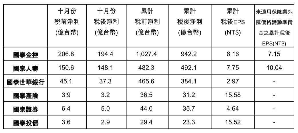 國泰世華銀行、國泰產險及國泰投信,累計前10月稅後淨利續創同期新高,國泰證券累計稅後淨利創同期次高。