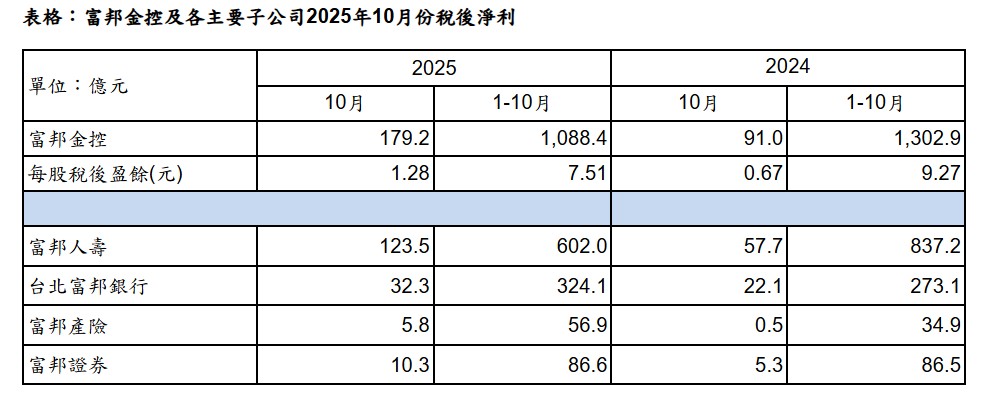 富邦金控及子公司富邦人壽10月獲利均為歷年同期新高;台北富邦銀行、富邦證券10月及累計前10月獲利皆創下歷年同期新高。