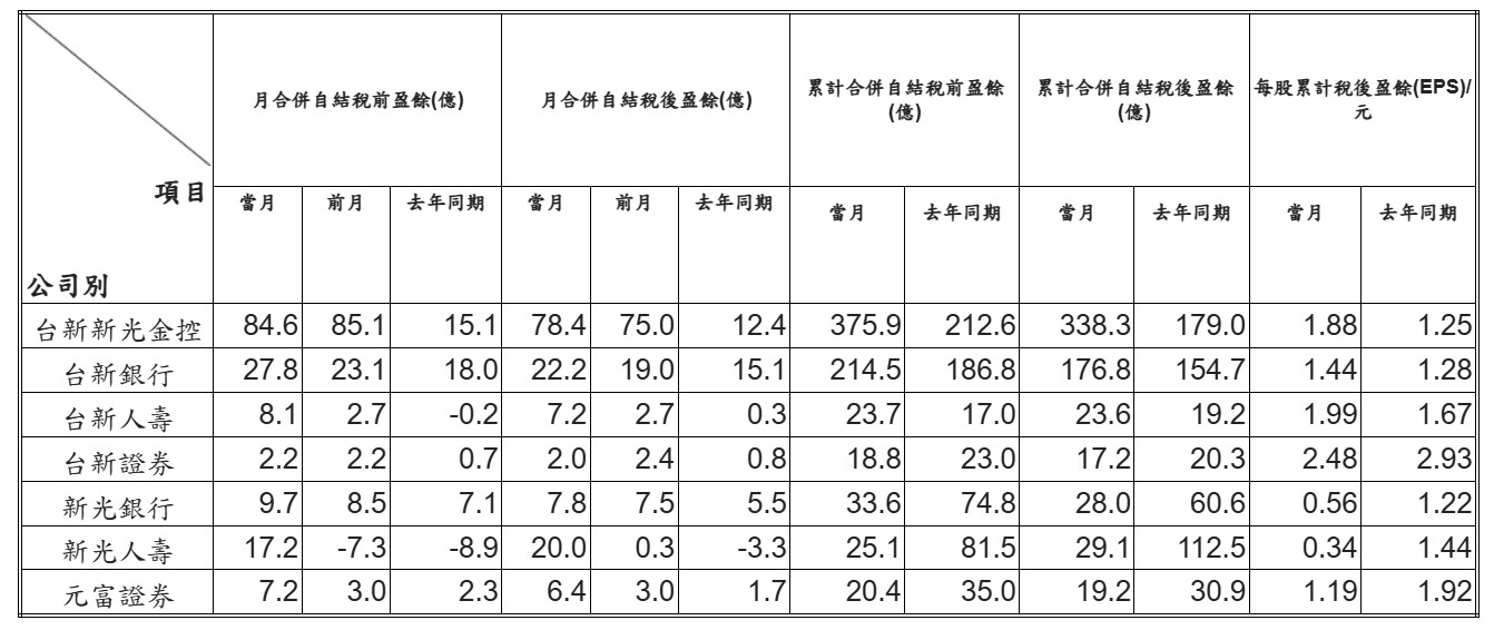 台新新光金今天也公布10月自結稅後淨利約78.4億元,累積前10月稅後淨利及每股稅後淨利(EPS)分別為338.3億及1.88元,躍居到金控第六名。