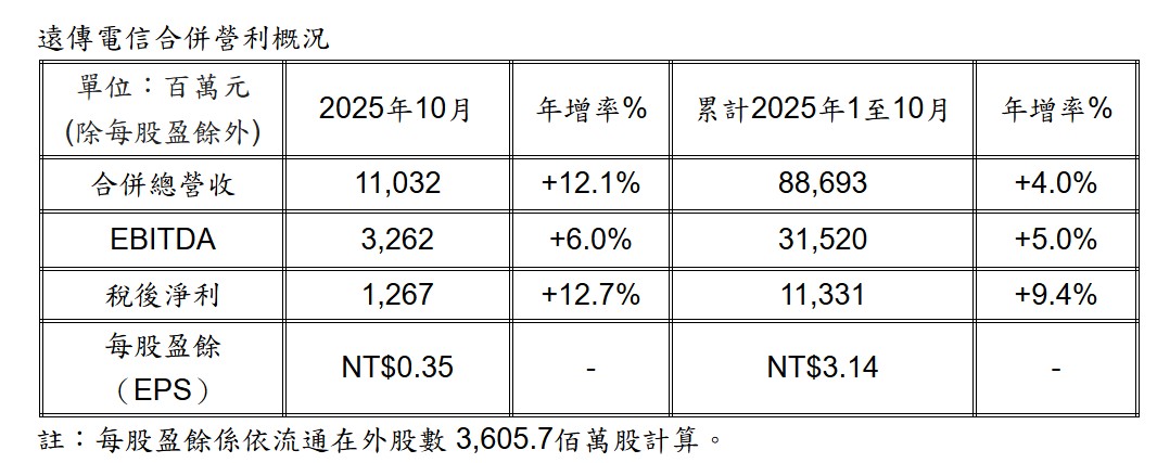 累計前10月,遠傳合併總營收、合併EBITDA和稅後淨利年成長率分別為4.0%、5%和9.4%,達886.93億元、315.2億元和113.31億元。累計每股盈餘(EPS)3.14元。