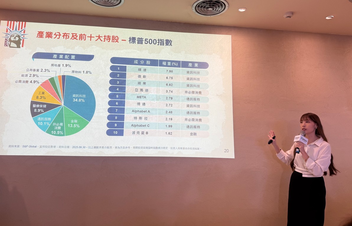 謝恩雅表示,其中,標普500指數是長期配置海外資產的理想選項。該指數橫跨美國11大產業,涵蓋科技、金融、醫療、工業及消費等領域,成分股多為具全球領導地位的龍頭企業,不僅能有效分散風險,也讓投資人掌握各產業輪動契機(如下圖,記者李錦奇攝影)。對台灣投資人而言,投資標普500不僅能強化區域分散配置,更能兼顧產業多元性與長期報酬機會,是參與美國經濟成長紅利的關鍵途徑。