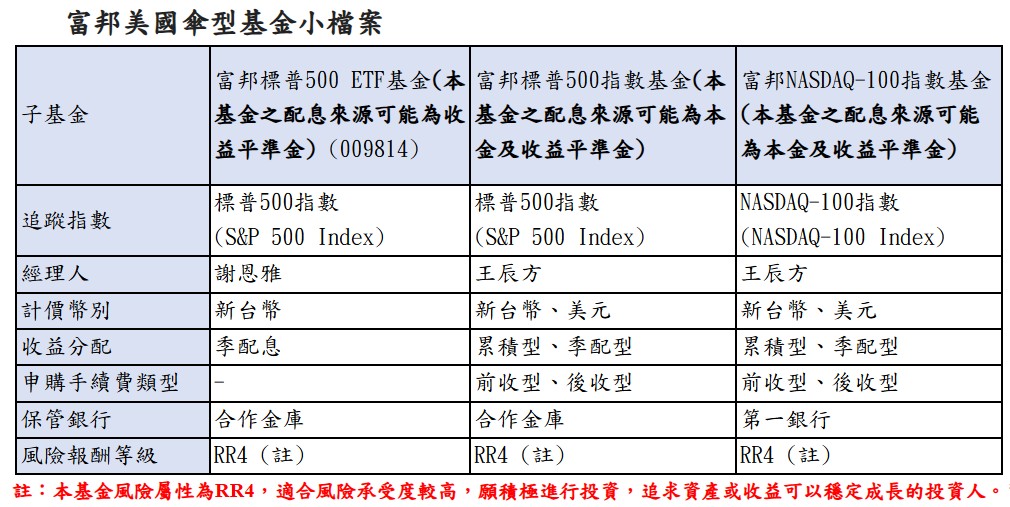 想要前進美股的投資人,即將有簡單新選擇!富邦投信推出「富邦美國傘型基金」,內含三檔美股子基金,包括富邦標普500 ETF(009814)、富邦標普500指數基金、富邦NASDAQ-100指數基金。