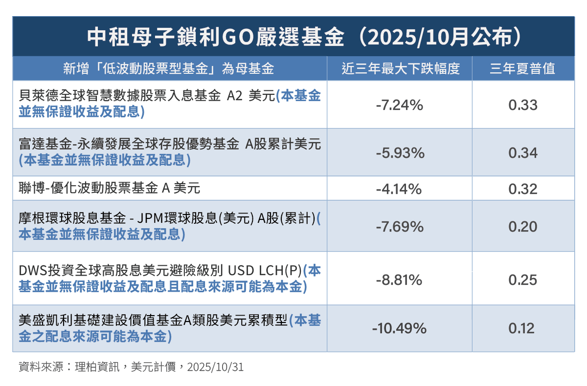 今年中租母基金嚴選標準有一項重大的戰略調整,就是首度開放將「低波動股票基金」納入「母基金」選項,過往母基金原則是只挑選債券型和平衡型基金。