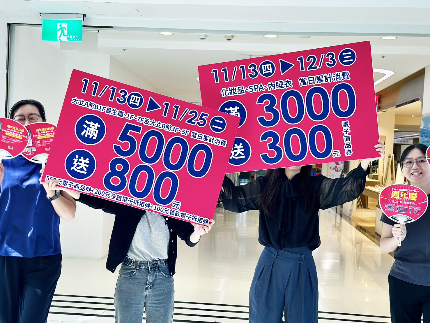 週年慶11月13日至11月25日期間,全館當日消費滿5,000元即可獲得800元;11月13日至12月3日期間,化妝品、SPA、內睡衣等櫃位當日滿3,000元再送300元;11月26日至12月3日刷大統集團聯名卡,滿5,000元即贈500元,層層回饋、誠意滿滿。