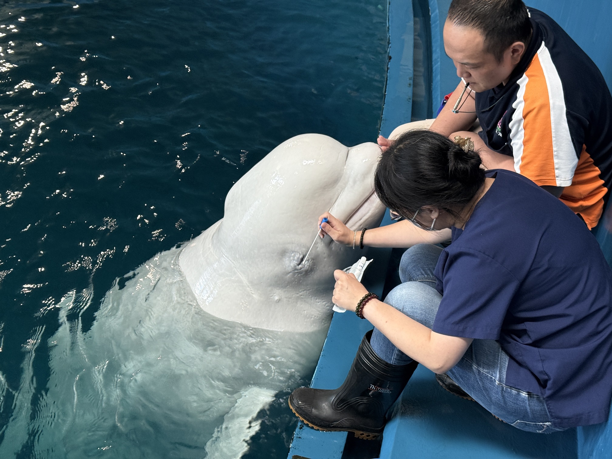 ↑圖說:白鯨非常配合獸醫的檢查,過程相當可愛。(圖片來源:屏東海生館提供)
