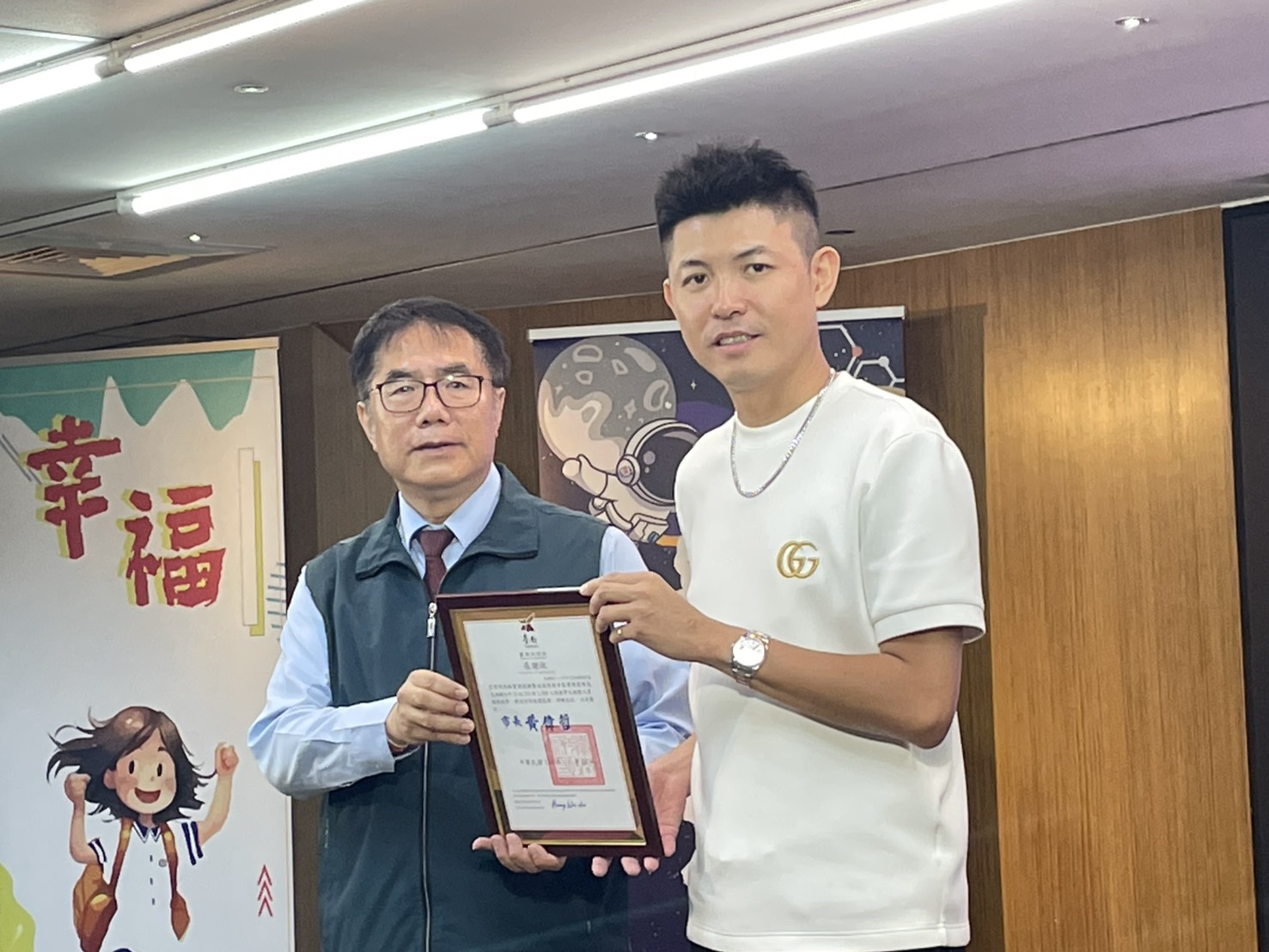 圖說:台南市長黃偉哲頒發感謝狀予宏偉時尚珠寶總經理陳榮華,肯定其支持特教學生助理人力,共同守護特教生的學習權益。(圖片來源/記者林薇安攝)